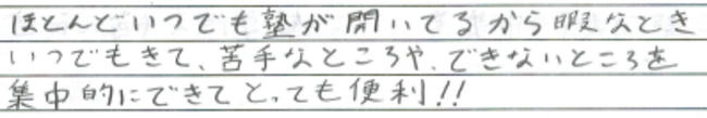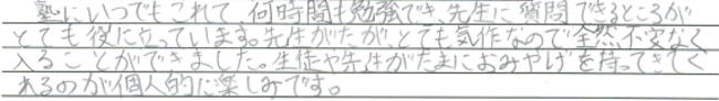塾にいつでもこれて、何時間も勉強でき、先生に質問できるところが、とても役に立っています。先生方が、とても気さくなので、全然不安なく入ることができました。生徒や先生がたまにお土産を持ってきてくれるのが個人的に楽しみです。