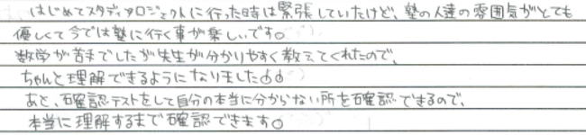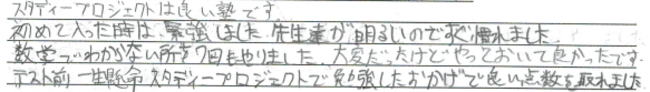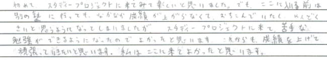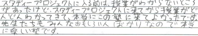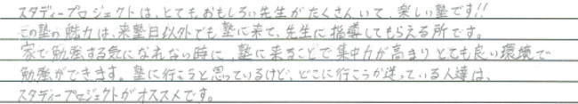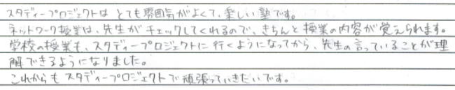 初めてスタディープロジェクトに来てみて楽しいと思いました。でも、ここに入る前は別の塾に行っても、なかなか成績が上がらなくて、おちこんでいたし、めんどくさいと思うようになってしまいましたが、スタディープロジェクトに来て、苦手な勉強ができるようになったので、よかったと思います。これからも、成績を上げて頑張っていきたいと思います。私は、ここに来てよかったと思います。