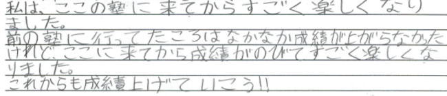 前の塾に行ってたころはなかなか成績が上がらなかったけれど、ここに来てから成績がのびてすごく楽しくなりました。