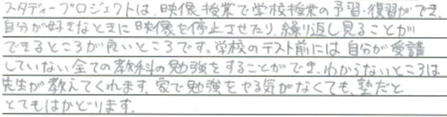 スタディープロジェクトは、映像授業で学校授業の予習・復習ができ、自分が好きなときに映像を停止させたり、繰り返し見ることができるところが良いところです。学校のテスト前には、自分が受講していない全ての教科の勉強をすることができ、わからないところは先生が教えてくれます。家で勉強をやる気がなくても、塾だと、とてもはかどります。