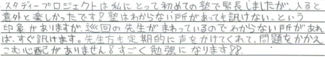 はじめてスタディプロジェクトに行った時は緊張していたけど、塾の人達の雰囲気がとても優しくて今では塾に行く事が楽しいです。