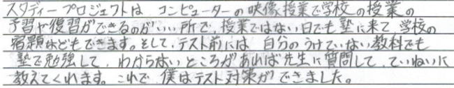 スタディープロジェクトはコンピューターの映像授業で学校の授業の予習や復習ができるのがいい所で、授業ではない日でも塾に来て、学校の宿題などもできます。そして、テスト前には、自分のうけていない教科でも塾で勉強して、わからないところがあれば先生に質問して、ていねいに教えてくれます。これで、僕はテスト対策ができました。