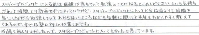 スタディープロジェクトに入る前は成績が落ちていて勉強のことになると、めんどうくさいという気持ちがあって時間とか計画せずにやっていたけど、スタディープロジェクトに入ってからは前よりも時間を気にしながら勉強していてわからないところなども気軽に聞けて先生もわかりやすく教えてくれるので、今では塾に行くのが楽しみです。